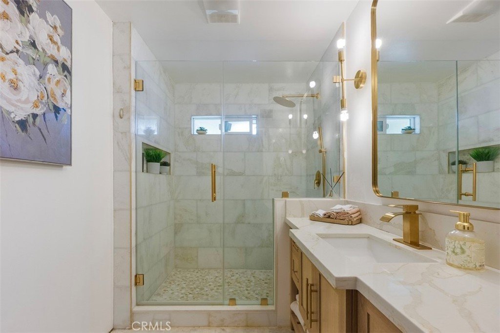 Back in the main portion of the home, two additional bedrooms offer generous closet space and share a beautifully updated guest bathroom featuring a modern walk-in shower. Inside, beautifully refinished original hardwood floors and an open-concept layout seamlessly connect the living room, dining area, and kitchen. Large windows fill the home with natural light while offering views of both the landscaped front yard and the spectacular backyard retreat. The spacious kitchen is designed for gathering and entertaining, featuring natural stone countertops, stainless steel appliances, custom cabinetry, a statement range hood, and a large center island with seating and ample storage.