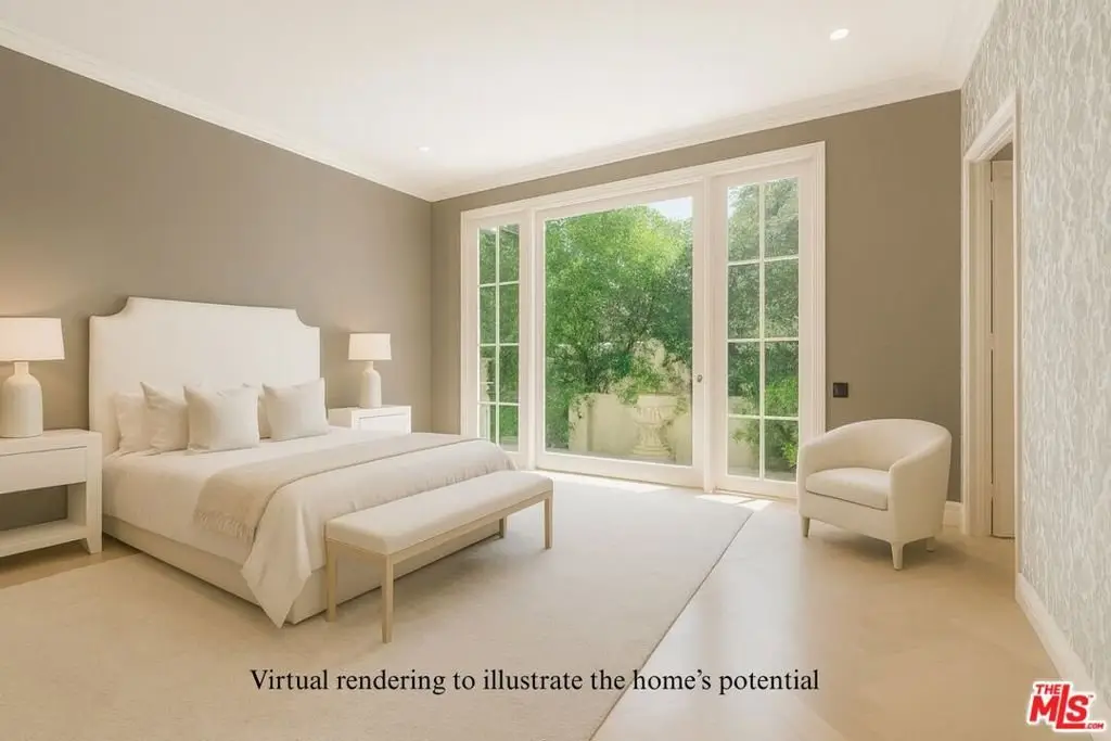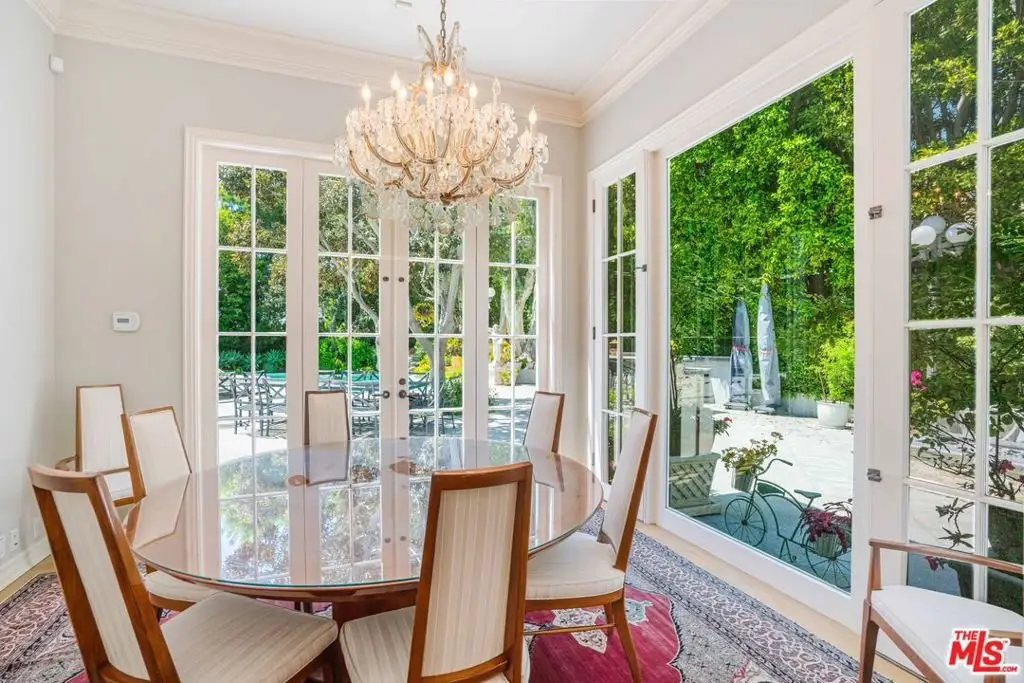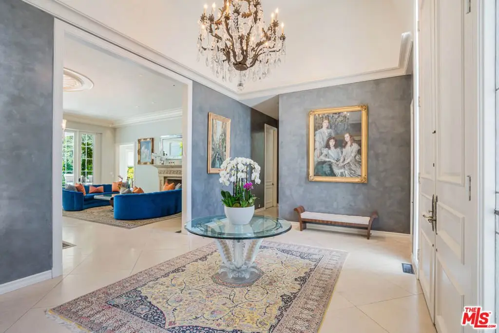 Introducing 915 Hartford Way, a timeless French Regency estate nestled behind private gates in prime Beverly Hills, just moments from the iconic Beverly Hills Hotel. This architectural gem blends elegance, sophistication, and serenity across beautifully landscaped grounds. Step through grand double doors into a dramatic two-story foyer. The formal living room showcases a stately fireplace and walls of glass framing lush surroundings. An open floor plan connects refined living spaces, including a formal dining room with soaring ceilings and tranquil views, and a charming breakfast room with direct outdoor access. The gourmet kitchen is a chef's dream, featuring a central island, top-tier appliances, and seamless design. A cozy family room/den boasts rich wood floors, custom built-ins, a fireplace, and an adjoining office. The luxurious primary suite offers a peaceful retreat with fireplace, dual walk-in closets, and a spa-like bath with soaking tub and walk-in shower. Two additional guest suites on the main level feature custom finishes and garden views. Upstairs, find a spacious guest room with its own bath and an expansive bonus room ideal for entertainment or play. Outdoors, enjoy a resort-style oasis with lush gardens, a covered terrace, pool, fire pit, bar, and multiple dining areas and lounge spaces. Additional amenities include maid's quarters, a wine cellar, and a 3-car garage. A rare offering of privacy, luxury, and proximity to world-class shopping, dining, and entertainment. Shown to prequalified buyers only. (Virtual renderings to illustrate the home's potential.)