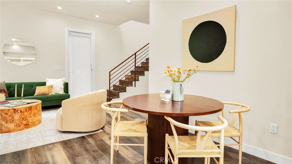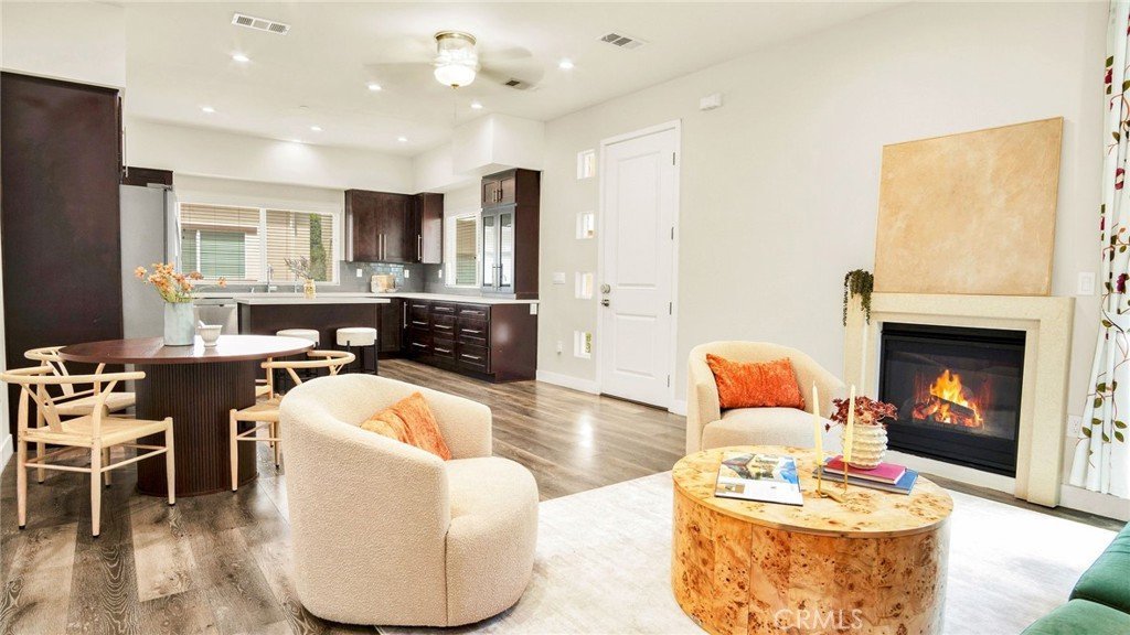 freeways. This two-story home features an open floor plan with a spacious family room, recessed lighting, and abundant natural light from large windows and a skylight.