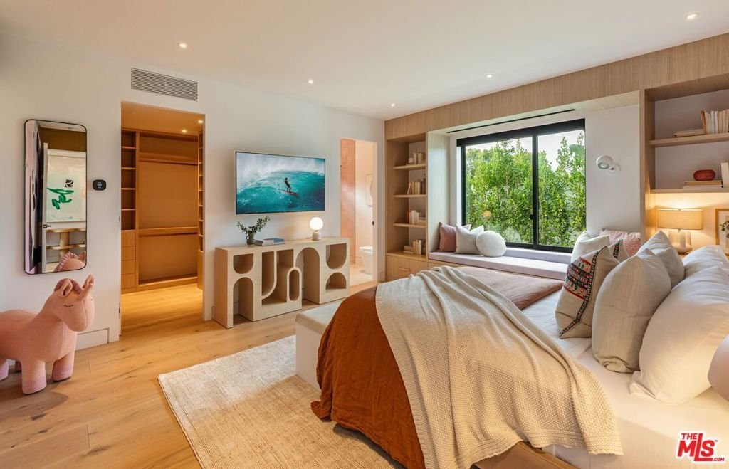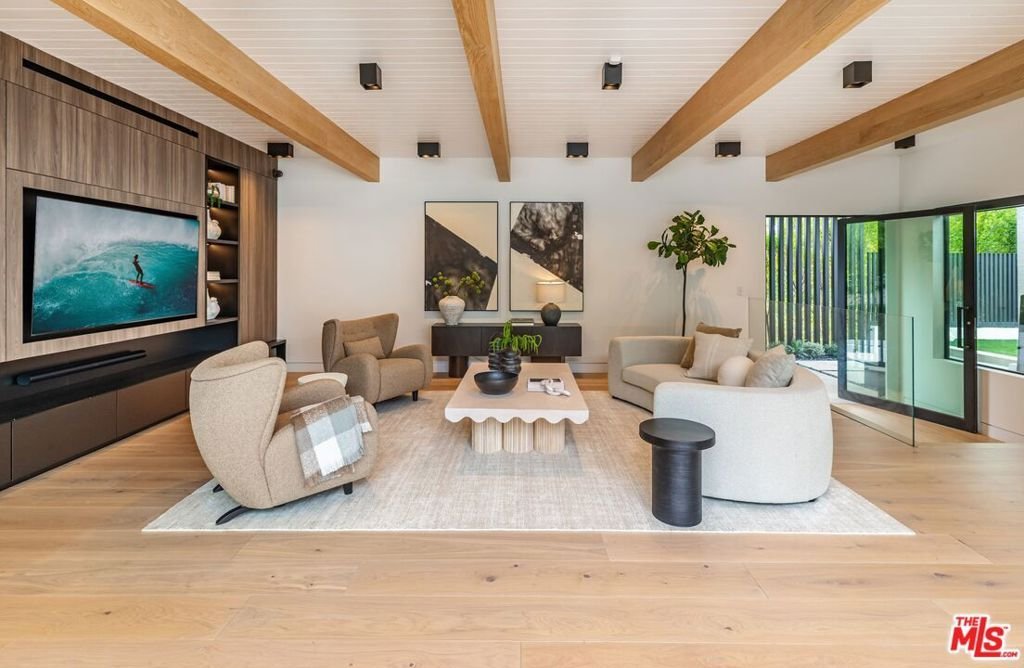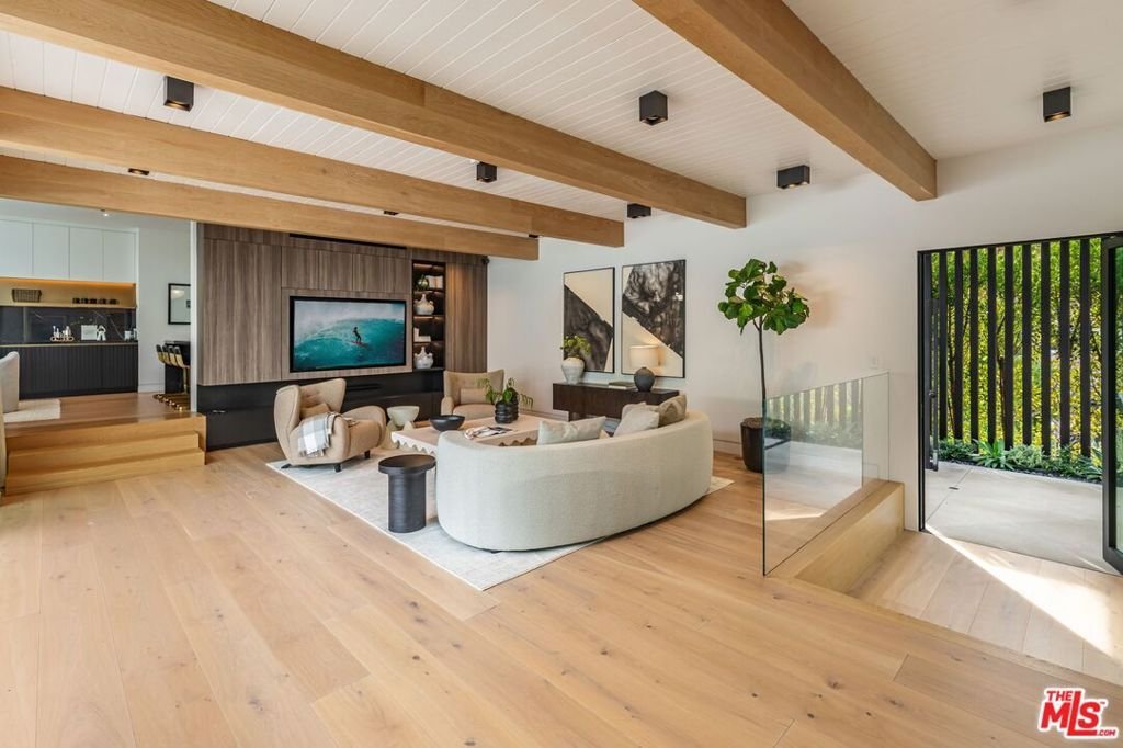 Fully renovated modern home in BHPO on a quiet street in Coldwater Canyon. Just beyond the front door, the formal living room has beamed ceilings and looks out to the spacious backyard. The dining room conveniently blends into the kitchen which features gorgeous black porcelain counters and high-end appliances, including double Sub-Zero refrigerators and 48-inch Wolf range. Glass walls allow natural light to fill the space and highlight the beautiful finishes and textures of the home, Fleetwood windows and doors throughout. The spacious primary suite features build projector and drop-down 130-inch screen, and offers a tranquil spa-like bathroom. Oversized sliding doors open for seamless indoor/outdoor living and entertaining featuring six-zone audio system. The sparkling pool with oversized spa is surrounded by areas for lounging, a built-in fire pit with seating, room for dining al fresco, and lush landscaping. This exquisite home flawlessly combines luxury and tranquility, making it the perfect retreat for sophisticated living and entertaining.