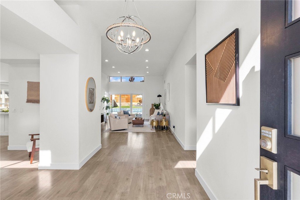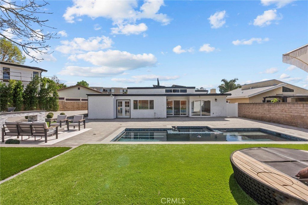 Welcome to your dream home in the heart of highly desirable Northridge! This beautiful 5-bedroom, 3-bathroom modern retreat sits on an expansive 12,000+ sq ft lot and offers thoughtfully designed living space and resort-style outdoor amenities. From the moment you arrive, the expansive paver driveway and sleek contemporary garage door create striking curb appeal. Inside, soaring ceilings, wide-plank flooring, recessed lighting, and an abundance of natural light set the tone for a bright and inviting interior. The open-concept layout flows effortlessly from the dramatic entry into the main living areas, ideal for both everyday living and entertaining. The spacious floor plan offers flexibility with five bedrooms, perfect for a growing family, guests, or a home office setup along with three beautifully appointed bathrooms. Large windows and sliding doors seamlessly connect indoor and outdoor spaces, enhancing the home’s airy, modern feel. Step outside to your private backyard oasis featuring a sparkling pool with water features and spa, expansive patio areas for lounging and dining, and a generous grassy yard anchored by a mature tree. In the fall, this tree blooms beautifully, creating a seasonal display that adds charm and warmth to your outdoor living experience. Multiple entertaining areas and privacy fencing create the perfect setting for gatherings or peaceful relaxation. As an added bonus, the home includes paid-off solar, offering energy efficiency and long-term savings.With its modern design, functional layout, and exceptional outdoor living, this home delivers the perfect blend of style, comfort, and sustainability. Located in one of Northridge’s most sought-after neighborhoods, close to parks, shopping, dining, and top-rated schools, this home truly has it all. Don’t miss the opportunity to make this exceptional property yours.