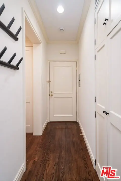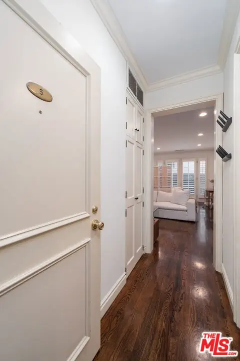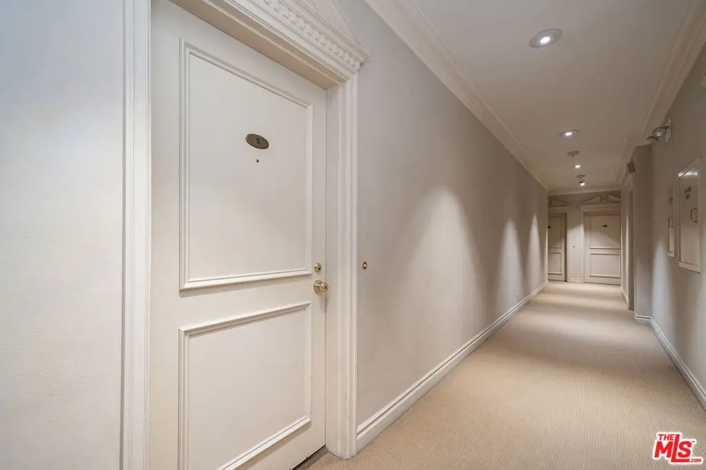 Manhattan-Style Pied--Terre sophisticated and upscale, this remodeled residence is located just steps from world-class shopping and dining, moments from Saks Fifth Avenue, the Beverly Wilshire Hotel, and Rodeo Drive. Designed to perfection by acclaimed interior designer Waldo Fernandez and architect Peter Choate, the stylish condo features a gourmet galley kitchen with a Viking six-burner stove, bluestone marble countertops, stainless steel appliances, and rich solid oak hardwood floors. High ceilings with crown molding, a luxurious marble bath, and French doors with custom plantation shutters create an elegant, inviting atmosphere. Additional highlights include a private terrace, Bosch washer/dryer, central heat & air, and two tandem parking spaces with locked storage in a secure gated garage. The building offers a rooftop deck with sweeping Century City and Beverly Hills views, concierge-level security with cameras, and elevator access. The tenant is currently occupied until the end of 2026, as per the lease agreement.