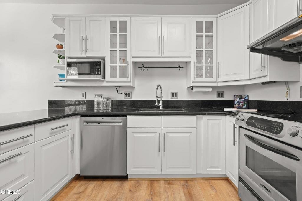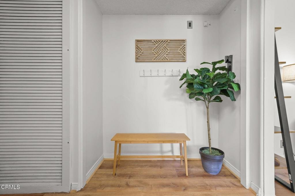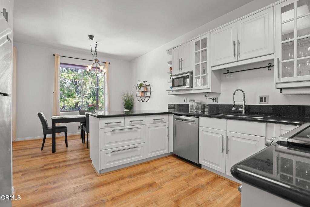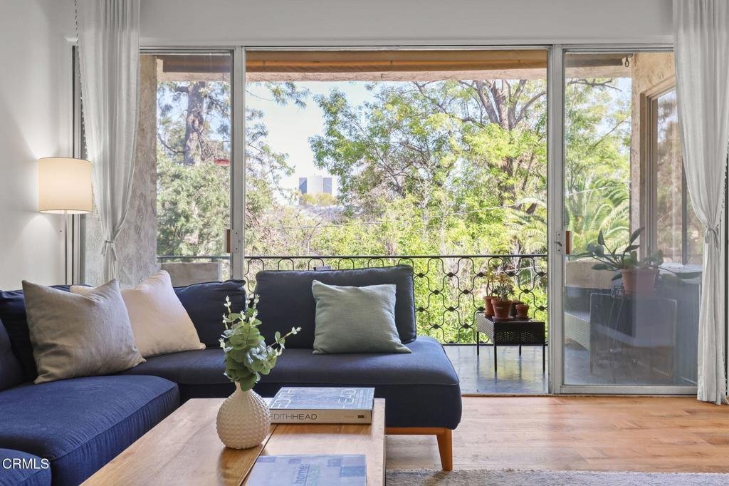This top-floor corner unit, with two bedrooms and two bathrooms, offers a great floorplan and is ideally located in a vibrant Pasadena neighborhood. Set within a wonderful Mid-Century Modern complex, this stylish unit features high ceilings, an open and airy floorplan with lots of natural light, hardwood flooring, and serene treetop and mountain views. A welcoming entry leads into a spacious living room with sliding glass doors which open to a good-sized balcony surrounded by flourishing plant life. The adjoining dining room offers picturesque treetop views and flows effortlessly into the beautifully updated kitchen, complete with newer stainless steel appliances, a skylight, granite countertops, lots of cabinetry, and a convenient breakfast bar. Down the hall is the impressive primary suite, complete with a vanity area, an extra-large walk-in closet and beautiful mountain views. The second bedroom off the hallway is currently being used as a home office, and includes a double closet for additional storage. A second full bath completes this wonderful condo, which also includes an in-unit laundry, a rare feature in this complex, creating ease for everyday living. The HOA dues cover some AMAZING extras that you typically do not see covered, such as walls-in insurance (as well as exterior building insurance), earthquake insurance, hot water, and electricity usage for the cooling system within the unit (this keeps the homeowner's electricity bills quite reasonable!). The complex, surrounded by lush greenery, features a sparkling pool and spa and a community barbeque area with 2 gas powered grills. One parking space is included with the unit and there are also multiple owner overflow parking spaces. Located in a fabulous pocket of Pasadena, this condo is close to Caltech, and is ideally positioned close to top-tier supermarkets such as Erewhon, Pavilions, and Trader Joe's, popular coffee shops like Starbucks and Peet's, Walgreens pharmacy, gyms and health spas like Planet Fitness and LA Fitness, and a wide array of additional restaurants and shopping options. Welcome home!